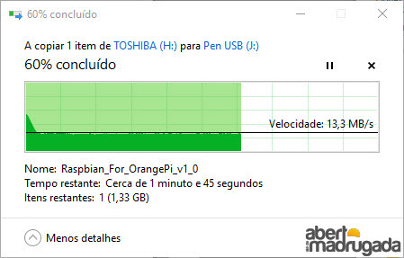 transferência de 13,3MB/s. Em leitura os 3.41GB demoram 107s a ser copiados