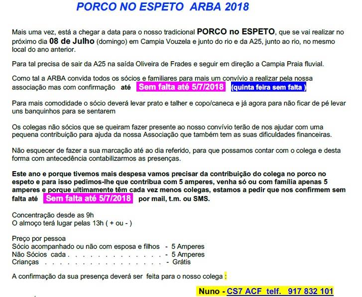 ARLA/CLUSTER: Porco no Espeto ARBA - 2018 - Confirmações deverão ser efectuadas até ao dia 5 de julho de 2018.